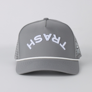Features a bold white "TRASH" arc embroidery on a sleek black crown, paired with a custom rope detail for added style.